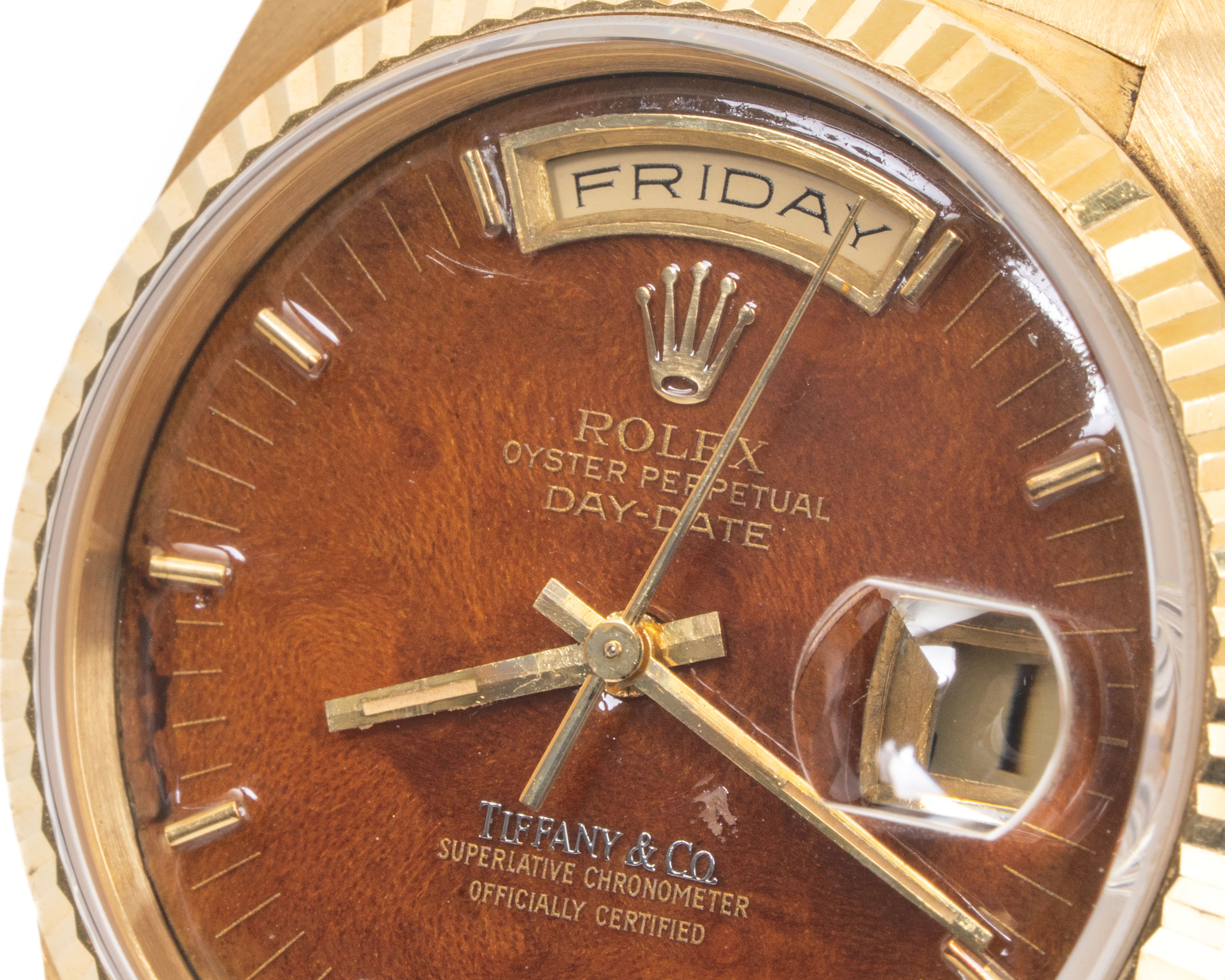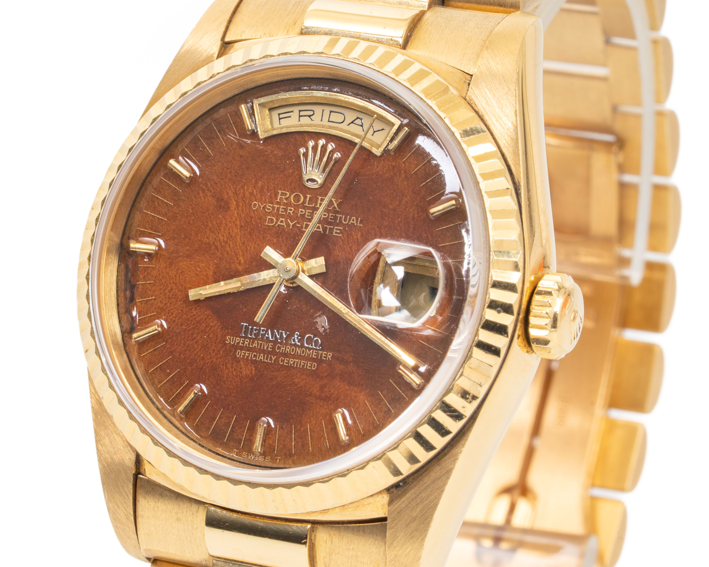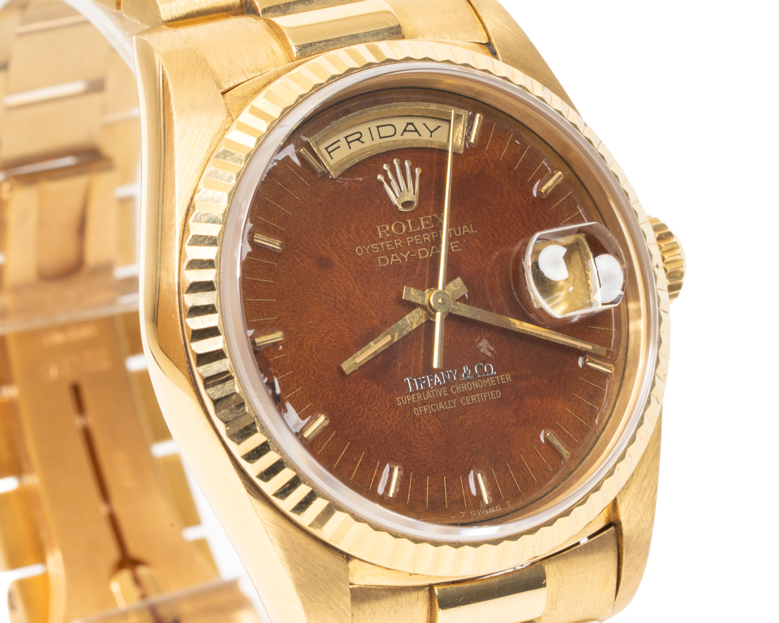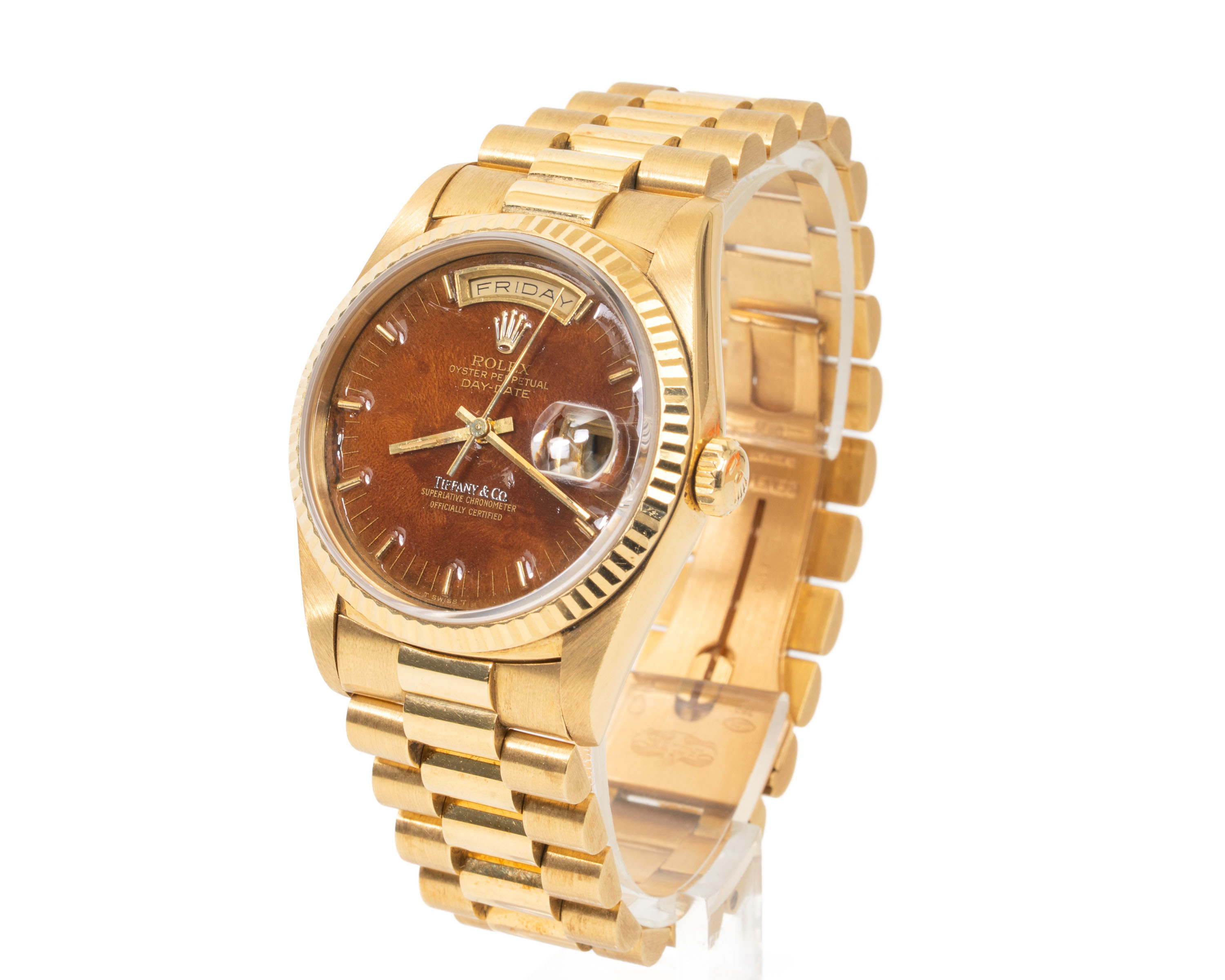 【拍賣會級別劳力士】Rolex/勞力士 Daydate 星期日历型 Ref.18238 Tiffany.co蒂芙尼 Wood Dial 木紋盤 K18黃金腕錶 #jp28810